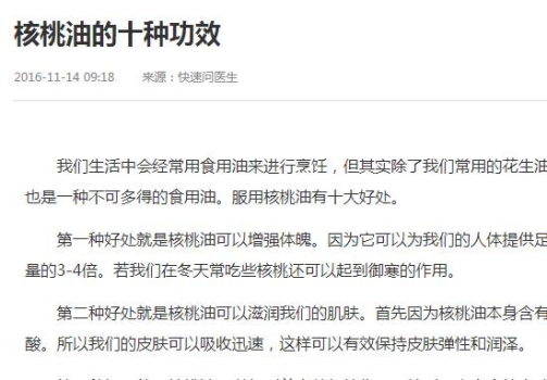我們生活中會經(jīng)常用食用油來進行烹飪,但其實除了我們常用的花生油、玉米油、菜籽油和橄欖油,核桃油其實也是一種不可多得的食用油。服用核桃油有十大好處。 第一種好處就是核桃油可以增強體魄。因為它可以為我們的人體提供足夠的熱量,它所釋放出來的熱量是米飯熱量的3-4倍。若我們在冬天常吃些核桃還可以起到御寒的作用。 第二種好處就是核桃油可以滋潤我們的肌膚。首先因為核桃油本身含有與皮膚親和力極佳的角鯊和人體必須脂肪酸。所以我們的皮膚可以吸收迅速,這樣可以有效保持皮膚彈性和潤澤。 第三種好處就是核桃油可以起到美容養(yǎng)顏的作用。特別是它富含的脂肪酸和角鯊?fù)榭梢允沟闷つw衰老得到很好的延緩,保持皮膚彈性,使肌膚潤澤飽滿。 第四種好處就是核桃油可以使得我們的秀發(fā)變得更加靚麗。因為常吃核桃油可以使得我們的頭發(fā)變得烏黑濃密,有光澤。 第五種好處就是核桃油有健腦養(yǎng)腦的作用。核桃油本身含有豐富的亞油酸和亞麻酸能排除血管內(nèi)新陳代謝的雜質(zhì),使血液凈化,為大腦提供新鮮血液。它沒有膽固醇,所以可以預(yù)防老年癡呆。 第六種好處就是核桃油有預(yù)防心腦血管疾病的作用。核桃油中富含不飽和脂肪酸、維生素等等,這些物質(zhì)可以替我們預(yù)防動脈硬化及動脈硬化并發(fā)癥、高血壓、心臟病、心力衰竭、腎衰竭、腦出血發(fā)生。 第七種好處就是桃油有提高內(nèi)分泌系統(tǒng)功能的作用。因為核桃油中的DHA可以提高胰島素的敏感性,當(dāng)細(xì)胞中不飽和脂肪酸含量越高,擁有的雙健數(shù)量越多,其活動性就越強。所以它有提高內(nèi)分泌系統(tǒng)功能的作用。 第八種好處就是核桃油可以補鈣。核桃油中的天然抗氧化劑和ω-3脂肪酸有助于人體對礦物質(zhì)的吸收如鈣、磷、鋅等,可以促進骨骼生長,保持骨密度。 第九種好處就是核桃油可以促進視網(wǎng)膜發(fā)育。因為核桃油中富含然的亞麻酸及維生素A,這兩種營養(yǎng)物對視網(wǎng)膜的發(fā)育至關(guān)重要.防止夜盲癥和視力減退,所以可以促進視網(wǎng)膜發(fā)育。 第十種好處就是核桃油可以保護腸胃、潤腸通便和滋潤肺腑。我國中醫(yī)認(rèn)為核桃油本身可以潤腸通便,是便秘人士的福音,但是也不能吃太多,因為核桃油本身也是非常容易使人上火的。摘自:快速問醫(yī)生