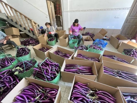 玉山縣紫湖鎮(zhèn)川橋村200多畝茄子,在大旱80多天之后仍然獲得了豐收。這是2022年10月10日拍攝的江西省玉山縣紫湖鎮(zhèn)川橋村村民,將茄子裝箱外銷。(艾世民攝影報道)
