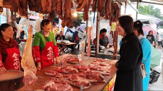 在四川,有立冬灌香腸、熏臘肉的習俗。香腸臘肉被川渝人視若珍寶,過年過節(jié)餐桌上少了它就少了年味、氛圍。恰逢立冬前夕,每年這個時候因為香腸臘肉,豬肉銷量都會較平常大幅上漲。為了抓住這個絕佳的商機,樂山肉脯老板楊大姐早早便來到了市場,擺上剛出欄的鮮豬肉,開始了尋常而又繁忙的一天。