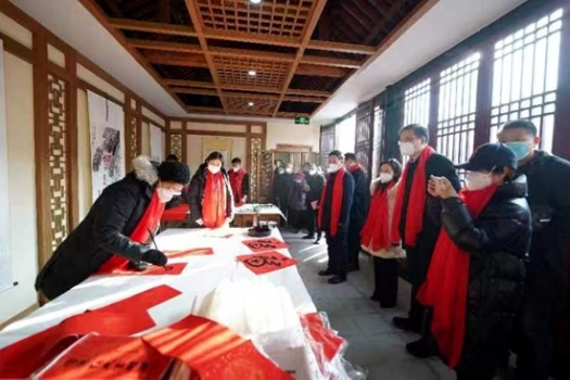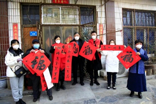 開幕式結(jié)束后鄭州文化館館長李桂玲一行,飽含熱情、揮毫潑墨,將一個(gè)個(gè)美好的祝福揮灑在紙上,把一句句祝福祈愿融入字里行間。把一幅幅書寫的春聯(lián)和福字,親自送到群眾手中,為他們送去新年的祝福,群眾的喜悅之情溢于言表。