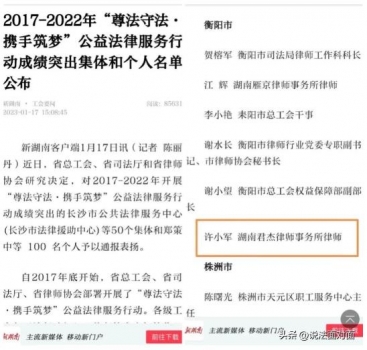 多年以來,許小軍律師堅守公益情懷,積極帶頭參與普法宣傳教育、法律援助案件辦理等各類公益法律服務活動。2021年,還得到衡陽市委宣傳部、市依法治市辦、市精神文明辦、市司法局共同頒發(fā)的“最美普法志愿者”榮譽稱號;此外,還被湖南省涉軍維權(quán)工作辦公室聘為“維護國防利益和軍人軍屬合法權(quán)益工作法律援助律師”;被衡陽市委統(tǒng)戰(zhàn)部聘為“全市統(tǒng)一戰(zhàn)線同心美麗鄉(xiāng)村法律服務律師”等公益崗位,榮譽的背后,體現(xiàn)著他一步一個腳印的堅持與努力。