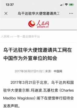 2017年3月,共工日?qǐng)?bào)作為烏干達(dá)駐華大使館在中國(guó)地區(qū)的指定宣傳媒體,為促進(jìn)中烏經(jīng)貿(mào)關(guān)系、增強(qiáng)兩國(guó)人民傳統(tǒng)友誼作出過(guò)積極貢獻(xiàn)。長(zhǎng)期以來(lái),共工日?qǐng)?bào)牢牢堅(jiān)持正確的輿論導(dǎo)向,得到全國(guó)各地黨委、政府以及政法機(jī)關(guān)等單位的高度認(rèn)可和支持。