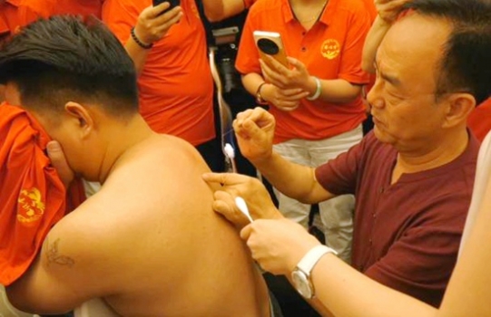 現(xiàn)場,趙百孝教授分別用手工火針和電動火針進(jìn)行對比。當(dāng)酒精點燃將火針燒紅時,不由得為“患者”捏了一把汗,當(dāng)看到趙百孝教授三針一氣呵成,不由得松了一口氣,當(dāng)為妙手。與傳統(tǒng)火針相比,趙百孝教授操作電動火針速度更快,“患者”3厘米大小皮膚連施十八針,不由得驚呆來讓在場人員。之后,獲得“患者”親身體驗電動火針的體驗者一致好評。