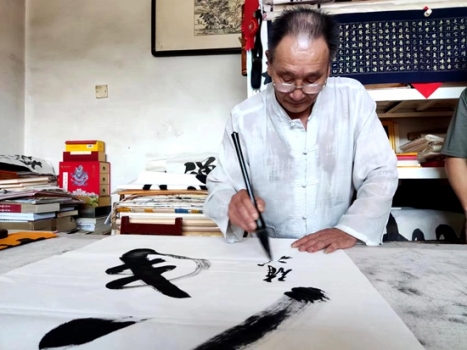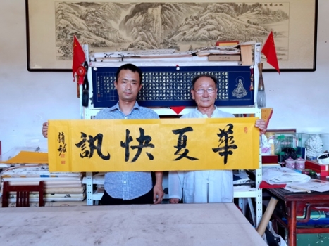 華夏快訊網(wǎng)總編王宏與河南廣播電視臺(tái)《中原視覺(jué)》制片人李明軍一行,應(yīng)邀到趙福先生家做客。我們走到時(shí),趙福先生已經(jīng)早早的在路口迎接我們,在書房里還看到書案上面未完成的作品。對(duì)趙福先生是聞名已久,這也是第一次見(jiàn)到本人。趙福先生雙眼有神,且十分健談,我們?cè)谝黄鹆奶旌苁娣?,說(shuō)到某些開心的事情不由得哈哈大笑。