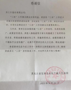 共工日?qǐng)?bào)社新農(nóng)村專題電(落聞)近日,共工日?qǐng)?bào)社收到來(lái)自黑龍江省寶清縣夾信子鎮(zhèn)政府的書(shū)面感謝信,感謝近幾年來(lái)共工日?qǐng)?bào)社致力夾信子鎮(zhèn)的宣傳和助推鄉(xiāng)村振興工作。
