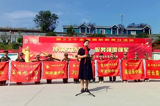(開(kāi)封市少工委副主任、開(kāi)封市三師附小德育副校長(zhǎng)高紅艷代表全省12支“英雄中隊(duì)”宣讀深入開(kāi)展全民國(guó)防教育倡議書(shū))