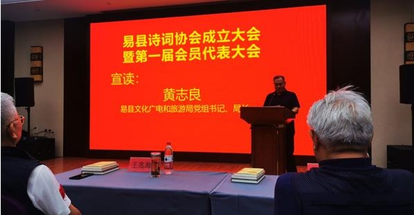 易縣文化廣電和旅游局局長黃志良宣讀《易縣文化廣電和旅游局關(guān)于同意易縣詩詞協(xié)會(huì)成立登記并作為其業(yè)務(wù)主管單位的函》。
