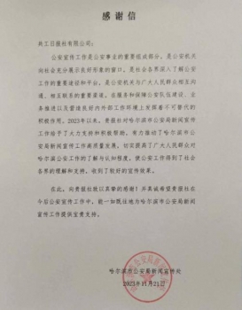 哈爾濱市公安局書面感謝信內(nèi)容顯示:公安宣傳工作是公安事業(yè)的重要組成部分,是公安機關(guān)向社會充分展示良好形象的窗口,是社會各界深入了解公安工作的重要途徑和平臺,是公安機關(guān)與廣大人民群眾相互溝通、相互聯(lián)系的重要渠道。在服務(wù)和保障公安隊伍建設(shè)、業(yè)務(wù)推進以及營造良好內(nèi)外部工作環(huán)境上發(fā)揮著不可替代的作用。