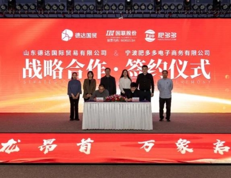 12月27日,國聯(lián)股份肥多多與山東德達(dá)國際貿(mào)易有限公司(以下簡稱“德達(dá)國貿(mào)”)在國聯(lián)數(shù)字經(jīng)濟(jì)總部簽訂戰(zhàn)略合作協(xié)議。國聯(lián)股份肥多多戰(zhàn)略發(fā)展部總監(jiān)徐策和德達(dá)國貿(mào)副總經(jīng)理楊勇作為雙方代表進(jìn)行了簽約。德達(dá)集團(tuán)總會計(jì)師、德達(dá)國貿(mào)黨支部書記/執(zhí)行董事趙延彬,德達(dá)國貿(mào)總經(jīng)理助理韓春梅,德達(dá)國貿(mào)財(cái)務(wù)部部長/風(fēng)控部部長趙薔,國聯(lián)股份副總裁、玻/肥多多CEO尹海鳳,國聯(lián)股份總裁特別助理冷軍良,國聯(lián)股份智慧云倉業(yè)務(wù)部總經(jīng)理蘇建強(qiáng)等人共同出席了簽約儀式。并就相關(guān)合作事宜展開深入交流。